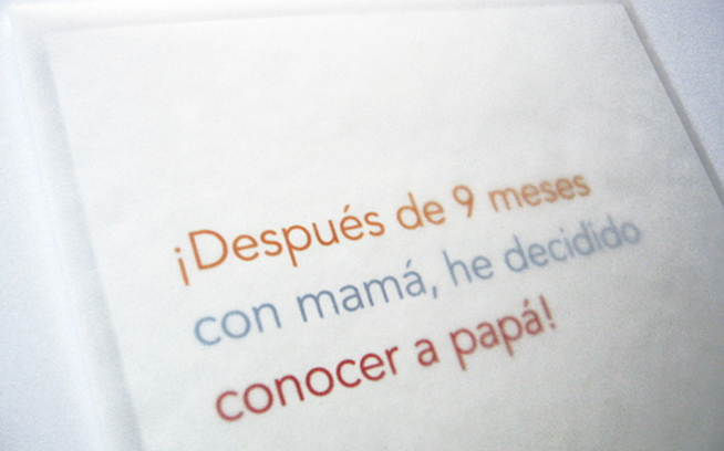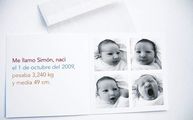 Square format of a four pages birth announcement with funny pictures of the baby inside, printed in 2009 in transparent envelopes.